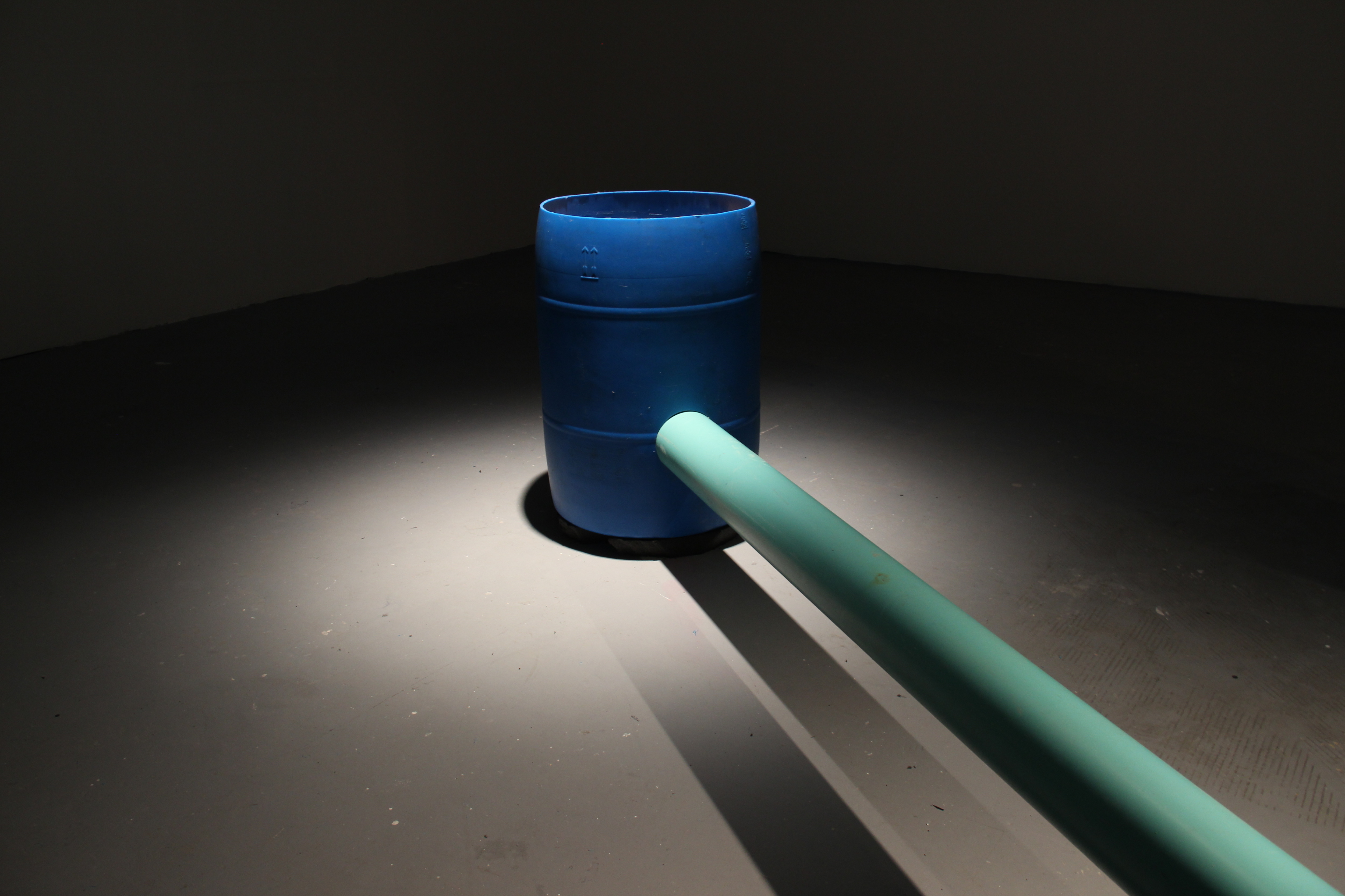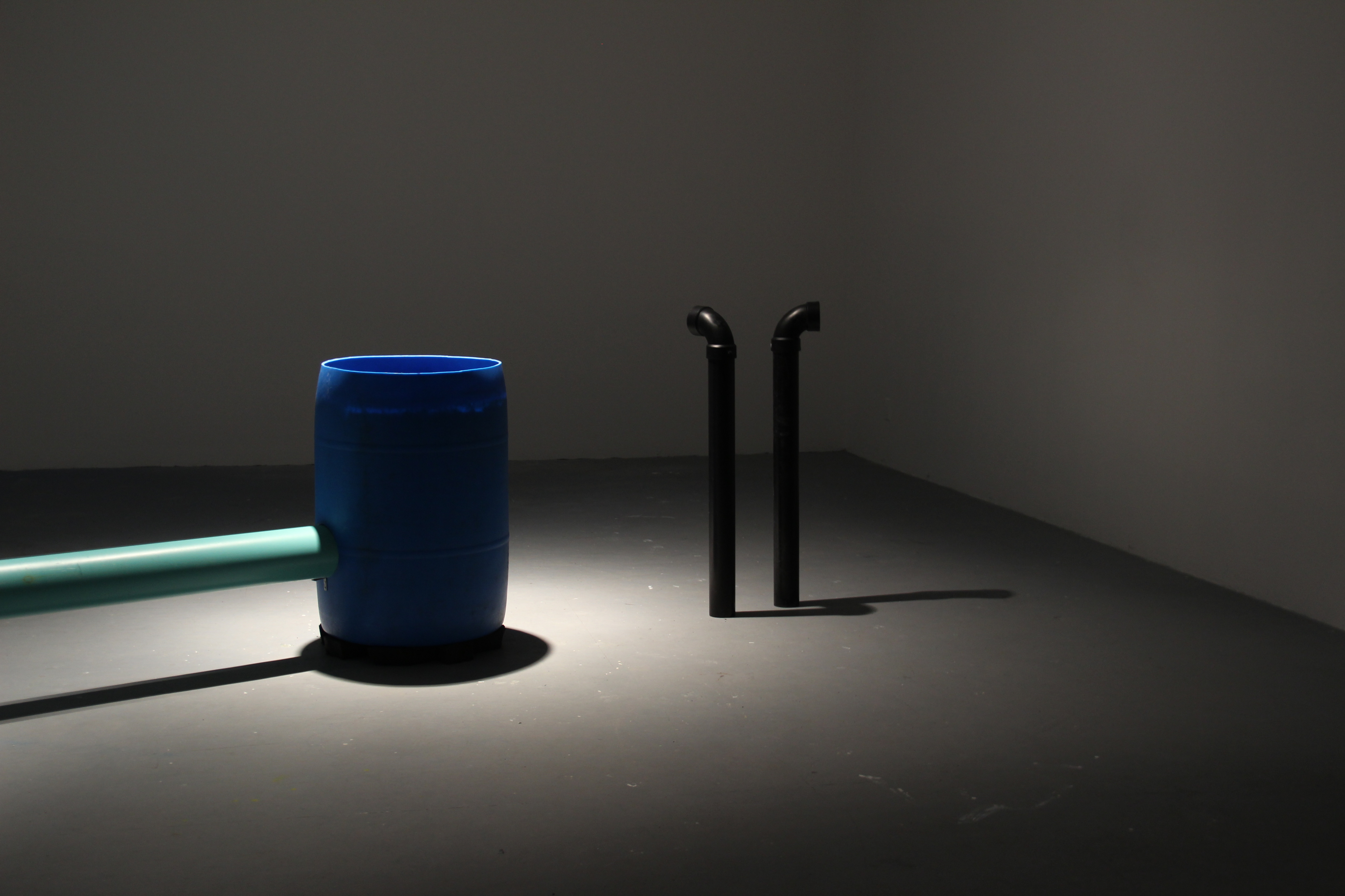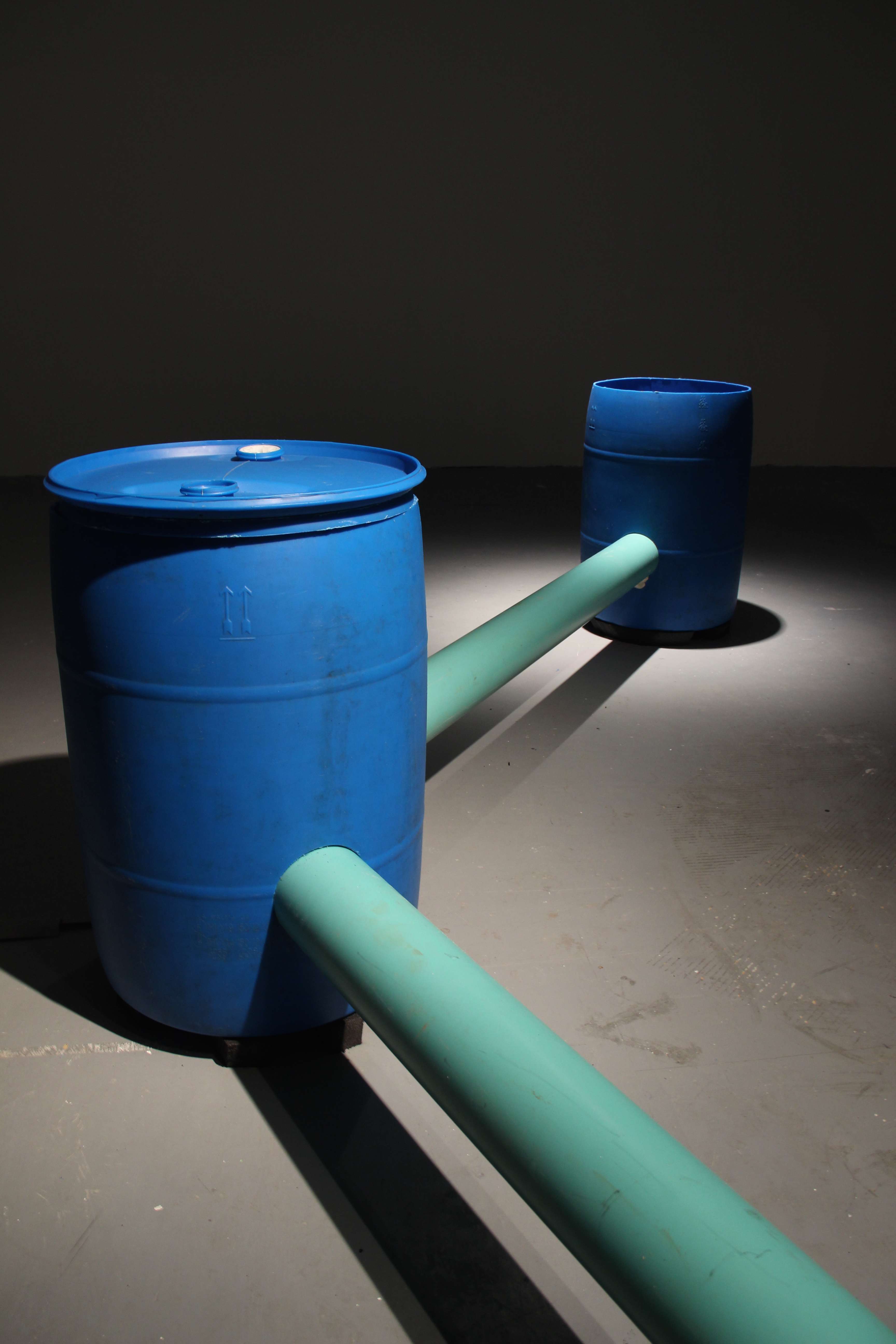 Projeto desenvolvido em residência no instituto La Chambre Blanche em Quebec City, CA, em parceria com MIS-SP. Sons internos do corpo (estômago, coração, ossos, etc) podem ser ouvidos embaixo d’água situada dentro dos galões. Os tons mais graves vazam ao espaço, enquanto que os mais agudos podem ser ouvidos através dos canos pretos ao serem inseridos dentro dos galões.